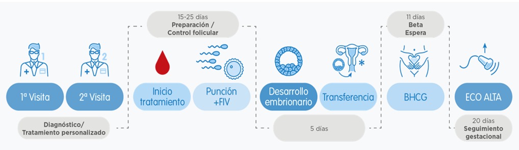 Finalmente se programa la transferencia embrionaria vía vaginal, un proceso sencillo que no requiere de sedación. Actualmente se recomienda la transferencia de un solo embrión, por ello la importancia de alcanzar el estadio de blastocisto en la cohorte embrionaria y así poder seleccionar el que tenga mayor posibilidad de implantar. El resto de los embriones se congelan para futuras transferencias. 9-10 días después se debe realizar la prueba de embarazo, si es positivo se realiza una ecografía de control para confirmar la presencia del saco embrionario y continuar con el embarazo.